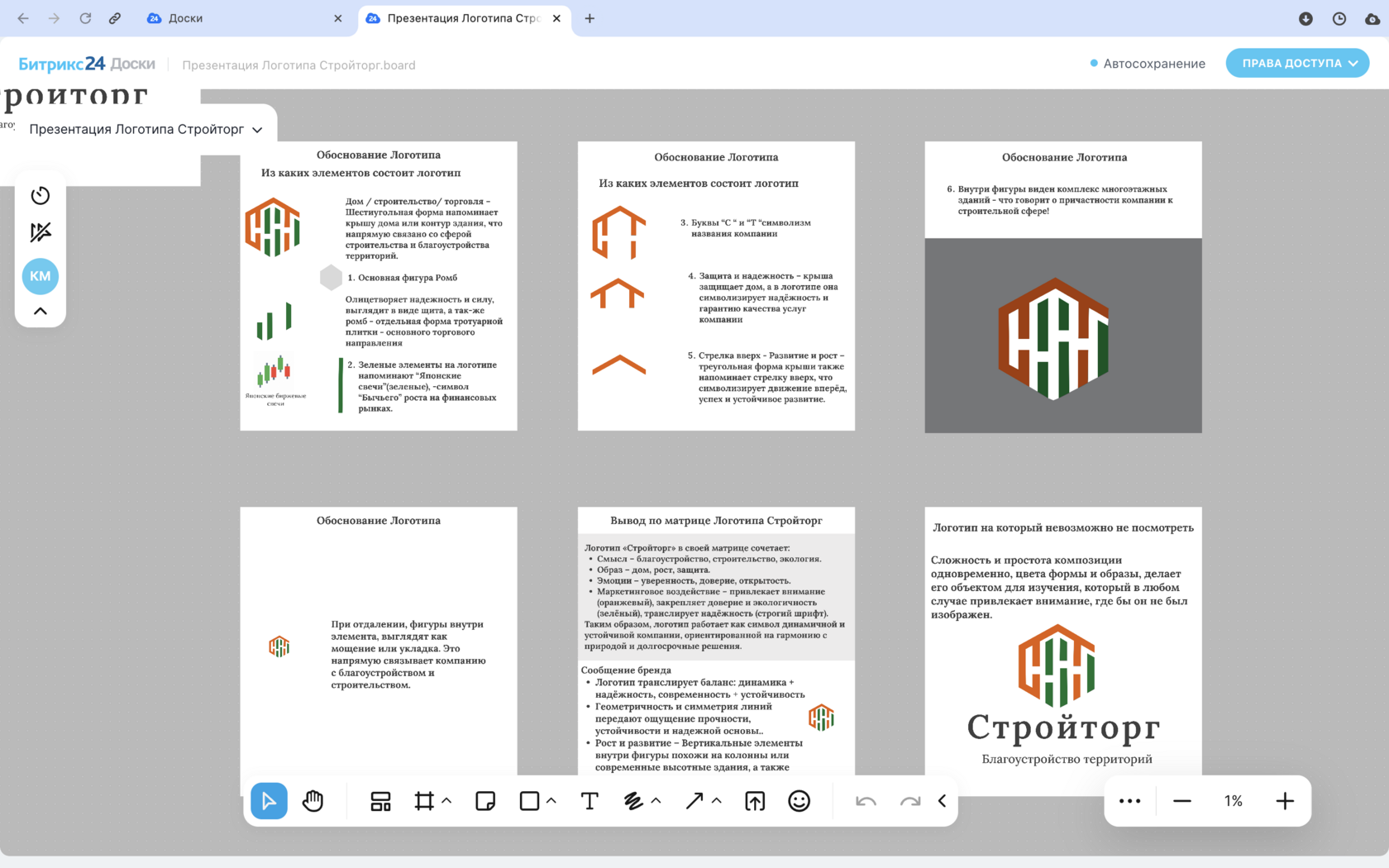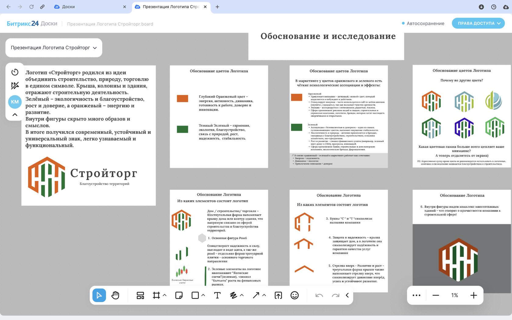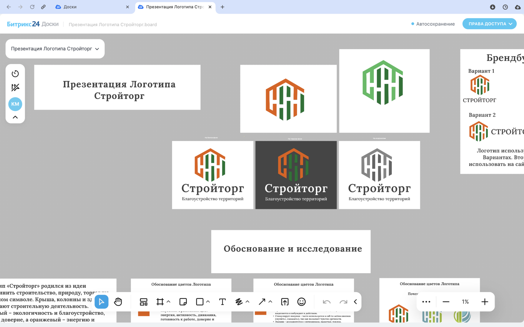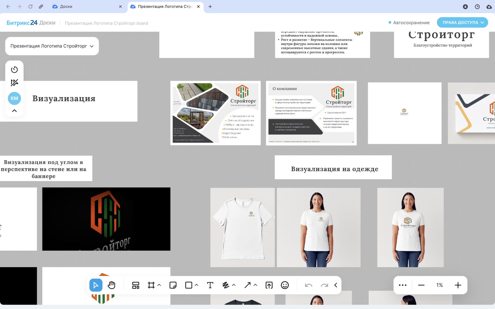 Компания использует корпоративную систему Битрикс24, там есть инструмент "Доска", позволяет визуализировать проекты и много другое, отечественный аналог сервиса "miro". Создал целый проект под названием "Презентация Логотипа для Стройторг", открыл доступ и разослал ссылку коллективу для ознакомления.